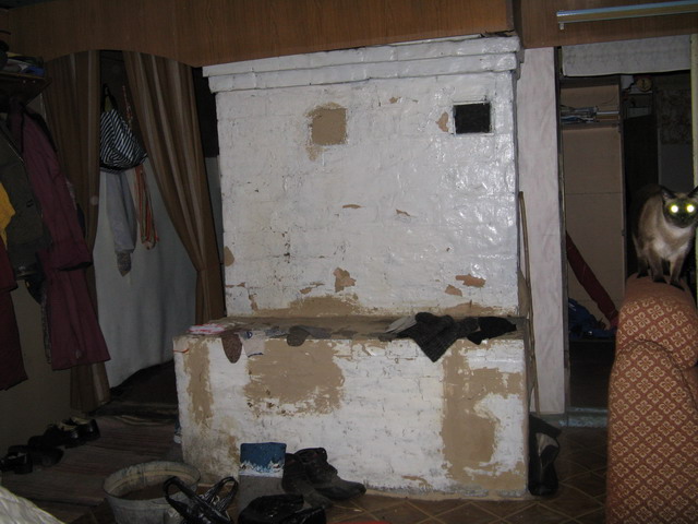 Слева от входа- глинобитная печь Русская ,без малого в четверть избы. Справа плита-подтопок с чугуным настилом. На большей конфорке готовят пищу ,а в малую вставлена жестяная однослойная труба обложеная глинобитом наподобии террикона высотой 200мм.Воная труба не доходя до потолка мм300 поворачивает на 90гр
