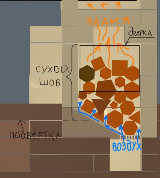 такое решение неприемлимо. правая часть топки будет нагреваться сильнеее и линейное расширение справа будет рвать топку.а левые кирпичики уже будут бессильны. есть такое понятие печной массив. картошку на сковороде посмотри как жаришь ивсе станет ясно. лучшее это враг хорошего.