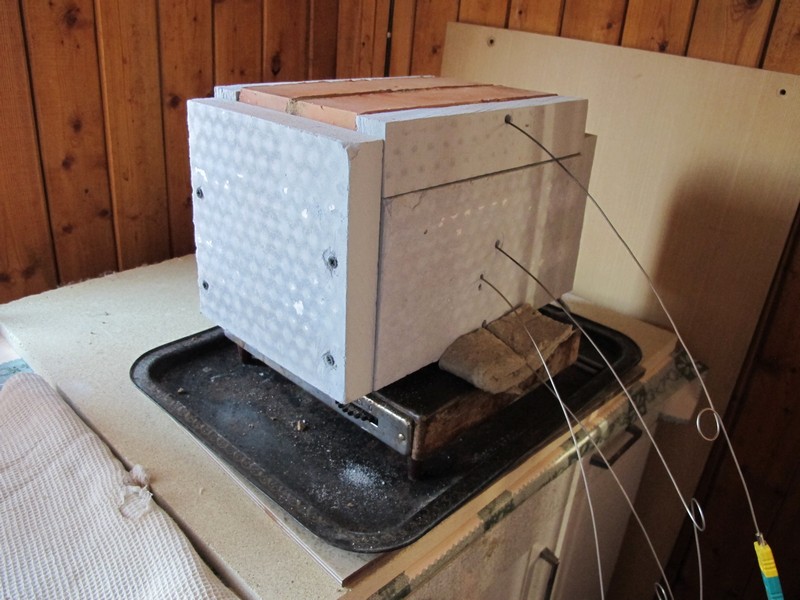 Второе, исключить остывание низа ША8 возможно, сделав механизм вытаскивания плитки из под кирпича. Нахождение всей конструкции в одинаковых условиях - угол комнаты с закрытой форточкой и дверьми с температурой плюс 25-27*С, пока это решение отложили и решено не усложнять стенд.