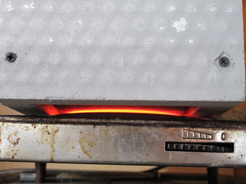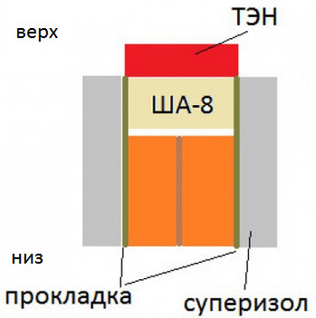 Конструкция помещена в короб из 30 мм суперизола с заделкой всех щелей базальтовым картоном. Кирпич ША8 уложен на электрический ТЭН, подключаемый в сеть 220 v. а внешняя часть М200 открыта.