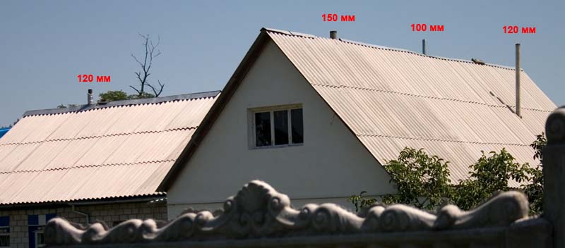 Ниже даю 2 фотографии дома под Киевом, на котором поставлено 3 асбестоцементные трубы (одна из них дополнительно снаружи утеплена) и металлического дымохода (неутеплённого), который работает с газовым котлом. Проходка крыши этими дымоходами — настоящее безумие. Но несмотря на указанные недостатки дровяные печи (и русская печь в том числе) в этом доме работают исправно с асбестоцементными дымоходами такого диаметра.