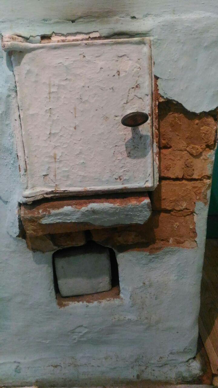 Ситуация следующая - обвалилась значительная часть "штукатурки" (глины) с известью, или как ее назвать. И от этого начал вываливаться кирпич под косяком железной дверцы. Появились щели. (фото)