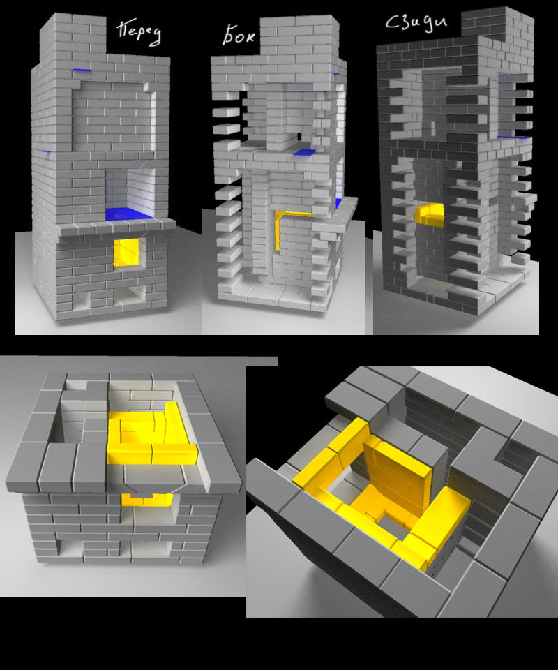 Видел такие рекомендачии к иным проектам от уважаемых мастеров, но, увы, не удосужился узнать о причинах явления. Буду рад если ктото поможет восполнить этот мой пробел. А суть в следующем - не стоит складывать стенки печи из кирпича, положенного на ребро. И суть не в том, что кирпичь на ребре лежит, суть в том, что стенка получается всего-ничего по толщине, поэтому тут впринцепе не важно попилен он вдоль или действительно лежит кирпичь на ребре. Этим термином обозначают толщину стенки. Если цель только эстетическая, то такой эркер можно выполнить и целым кирпичём, утопив его на нужную глубину во внутрь конструкции. Плохо или хорошо будет прогреваться второй колпак в большей степени зависит не от размера колпака второго, а во многом от того, правильно ли рассчитан объём и мощность топливника (склько дров в него поместится разом и сколько он будет выделять энергии) относительно мощности всей печи в целом с учётом КПД топливника и колпаковой системы. Если эти показатели учесть, то все будет прогреваться согласно спецификации конструкции. А если топливник мал, то пргреваться не станет не только второй, но и первый колпак.