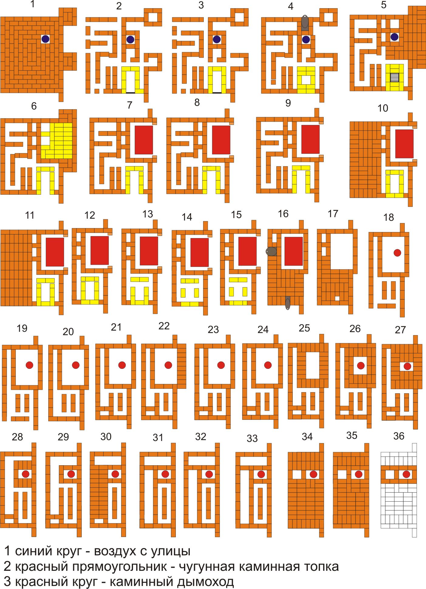Конвективных входов 2. Один из комнаты, он в четвертом ряду заслонкой перекрывается, а второй из под пола с улицы, он перекрывается дисковой заслонкой под полом. А выход через трубу между каминным дымоходом и кирпичной обкладкой. Через 10 рядов в кирпичной трубе продух будет. Специально повыше чтоб тяга получше и чтоб прогревалось по тщательней. А зслонка в 4 ряду чтобы холодный воздух из под пола при открытых заслонках в комнату не вползал через нее, это ведь свободное движение газов холодный воздух вниз польется и окажется на полу, нет может его конечно утянет вверх и прогреет по дороге, но рисковать нехочется.