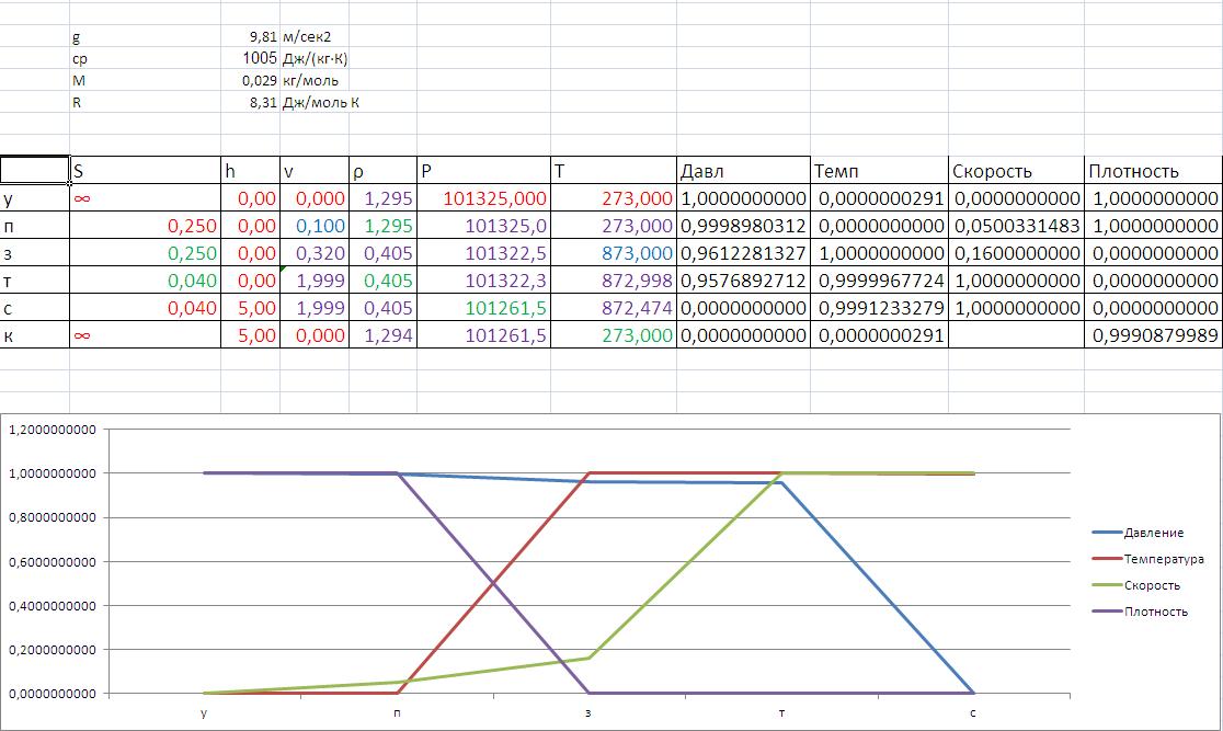 Задал начальную скорость на входе 0,1 м/сек и нагрел топку до 500С (с горением пока не разбирался - эти величины должны завязаться через формулу гореия, а также поплыть М и сp).