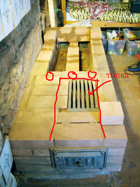 На этом месте стояла другая лежанка и тоже была в плотную к стене. У неё провалился верх, т.к. была неправильно была сложена. А прижимается она не к стене, а к стенке за которой есть оборотные каналы этой же лежанки. Воздух проходя по ним греет стенку над лежанкой. Поэтому если треснет, то весь воздух уйдет в каналы.