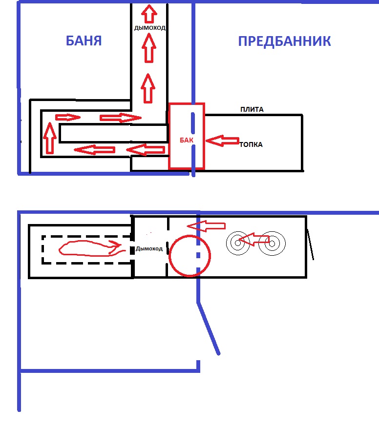 Я как вариант (на 2 схеме) думаю а не пустить ли дымоход через этот объем (красными стрелками показано предполагаемое движение горячего дыма), а затем вверх в трубу, оставив некоторые зазоры у стен, чтобы нагреваясь печь максимально тепло отдавала в баню. Но не знаю с инженерной точки зрения насколько грамотно, будет ли тяга обеспечена.