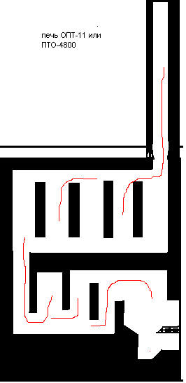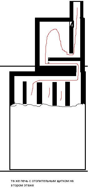 Этот приведённый рисунок-схема каналов. Тогда я рисовал в бухгалтерских тетрадях в клеточку. Схему, сделанную для "рукастого" заказчика, скопировал потом в Ворде... порядовки сесно, не сохранились, тк ими розжигалась первая топка... Проектировалась та печка для конкретного помещения-планировки... Печь была с плитой-настилом варочным (сталь) в кухню, с духовым шкафом (чугун), нижнего подключения к щиту отопительному, преимущественно нижнего прогрева (ПНП) двухярусная - двухколпаковая. Третий колпак на втором этаже - параллельно подымающиеся каналы. Второй этаж скопировал со старой печи в сельской школе. Топливник и размеры всей печи определялись под задачу - прогреть квартиру в два этажа с топкой лишь на первом. Без устройства в щитке дополнительного подтопа было немного стрёмно, но слава Богу - справились. Конденсата нет даже на сырых дровах в промозглую погоду. Поддувальная дверца 250х130 с отверстиями для избыточного притока воздуха на горение. Задвижки 250х250 позапрошлого века (чугун тоненький, но крепкий), топочная - ДТ5, в топке два колосника 200х250 подряд. В качестве настила - плита стальная 20 мм. Топка футерована шамотом на ложок (на ребро) через листы минваты (какой - не ведаю).