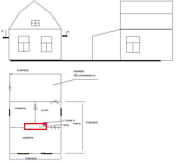 Каминая топка (дверца со стеклом) должна выходить в большую комнату, плита на кухне. Лучевое тепло пламени прогреет большую комнату а плита прогреет быстро кухню и через открытую дверь и малую комнату, и к окончанию топки (1-2 часа) нагреется и печь которая должна отдавать медленно тепло около 24 часов (сутку).
