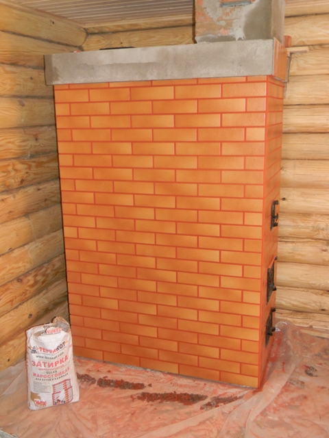 Штукатурил по сетке, штукатурная смесь Терракот. Клинкер-Польша, глазурованный. Клей Termix-IVSIL. Топку, на сколько достану усилю лещадкой на мастике, то-же Терракот. Той-же мастикой в перемешку с песком забил высыпавшиеся швы. Так что должна ещё топка поработать.