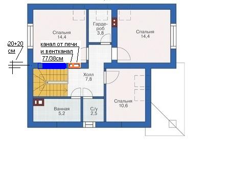 Да ещё и потребуется отопительная печь, или щиток от печи первого этажа, на втором этаже между спальнями. Немного понадобится перестановка перегородок между ними.