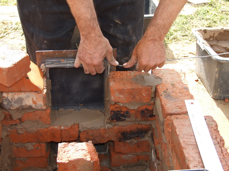 Ширина сделана в кирпич (250 мм), а глубина в 1.5 (380 мм) кратно ША8. Зольник выкладываем на ребро, под топливника на плашку кирпич ША8. Перекрытие спереди вырезано из кирпича ША9 (300х150 мм) и вставлены вставочки по краю для дальнейшего поднятия стенок топливника.