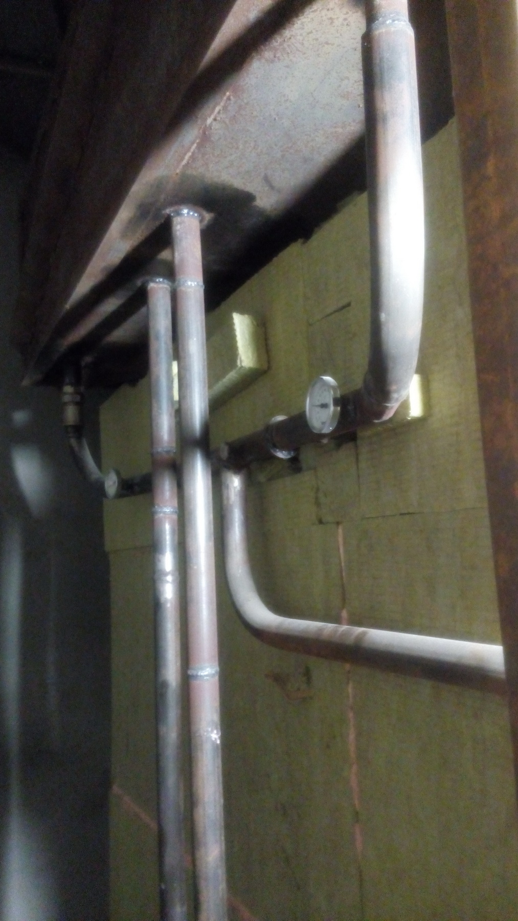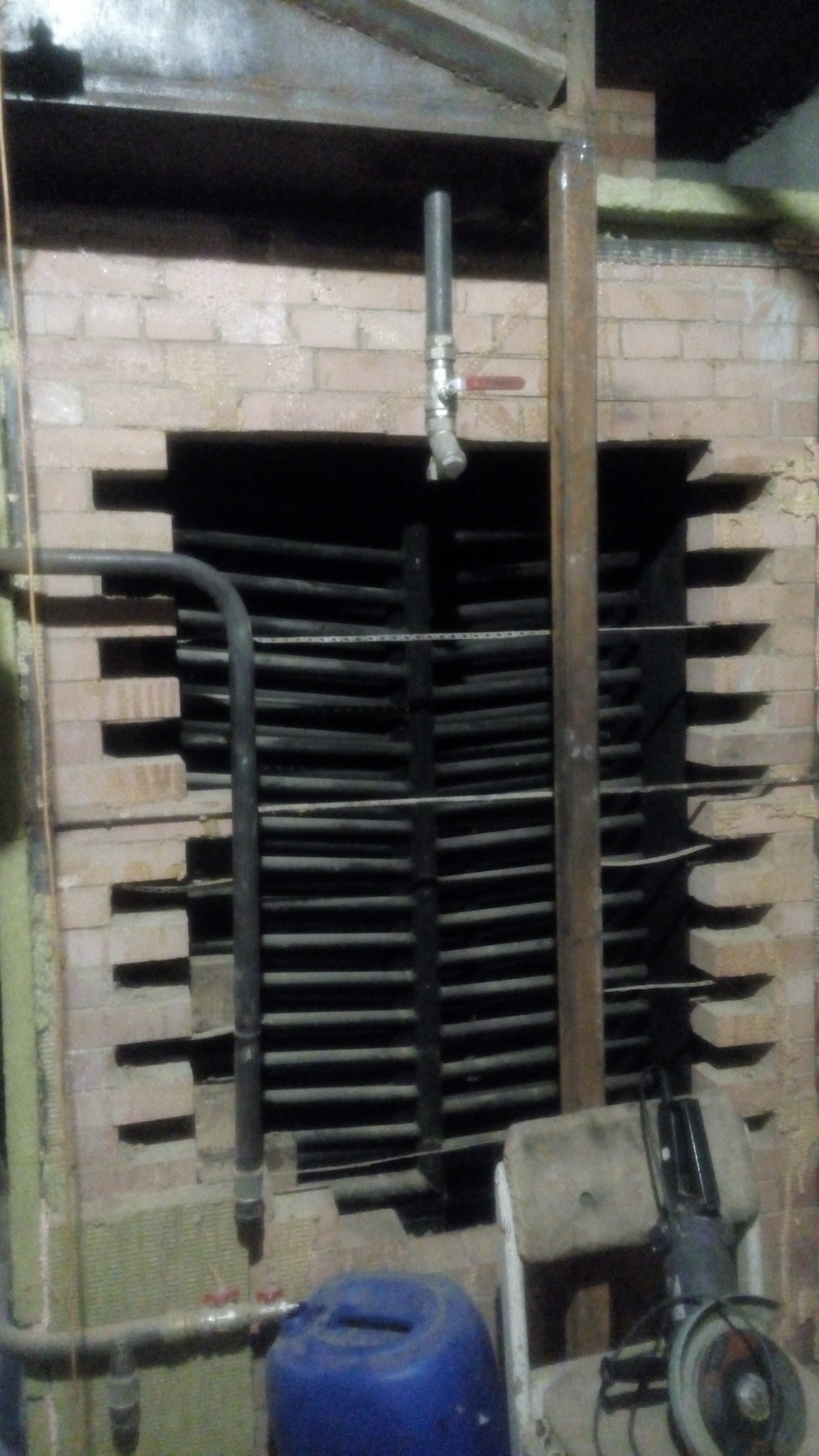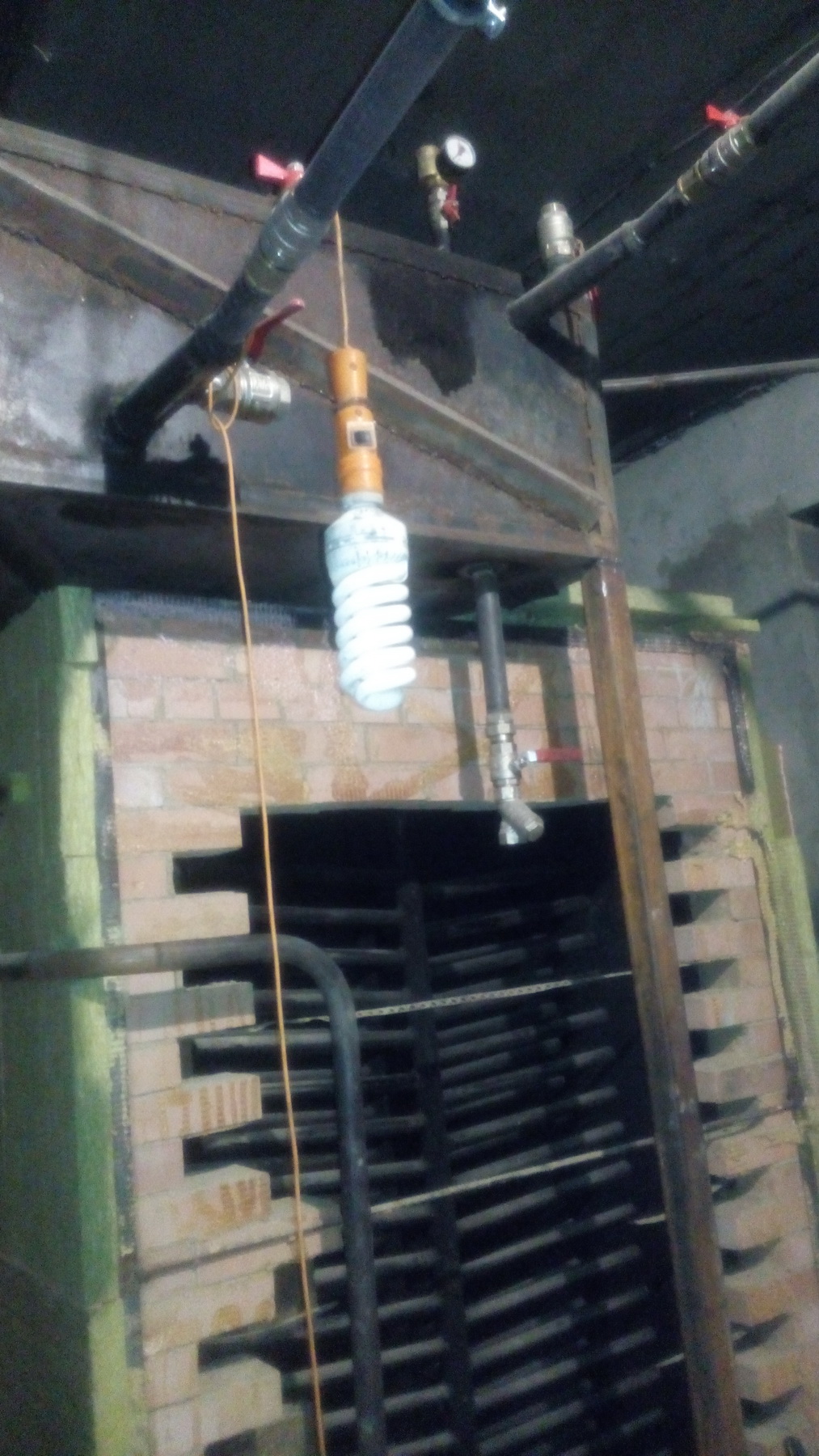 В печь встроены два регистра из нержавейки, супер регистры от самого Кузнецова. На печке сверху смонтирован бак из металла на куб воды. Система отопления принудительная. На фото - разобранная стена печи с регистрами. И общий вид разводки. Регистры стоят не в камере сгорания, а в следующей. Печь - шамот, снаружи обложена красным.