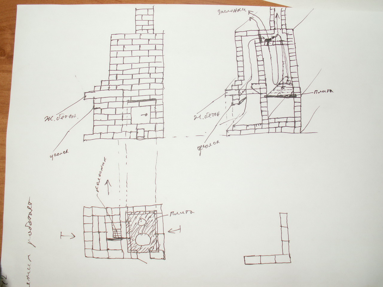 больше всего мне подходит ОИК К4, но всё равно не самое то что мне надо. Я от руки набрасал то что я хочу сделать,(простите за отсутствие пропорций.). я бы хотел сделать более широкий камин и более широкую(на 1 кирпич) топку. Соответственно перекрытие топки хочу сделать из варочной плиты, а над ней пустить дымоход.