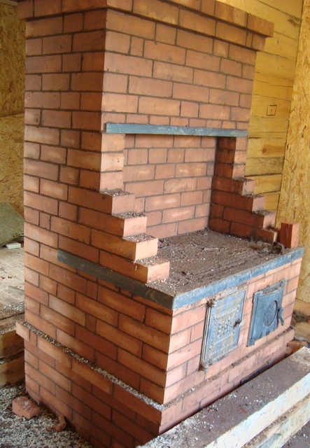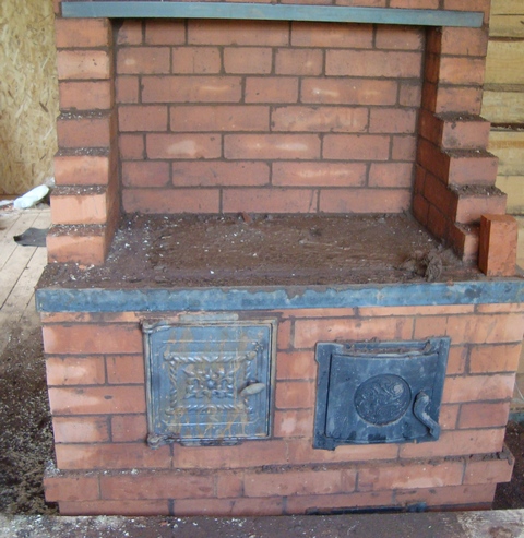 Самоделка-вариация на тему шведка. Фотографии соответсвуют, просто на одной вводит в заблуждение пачка досок. По духовке: 1 опустить на ряд, но не ниже топочных дверок 2 под духовкой нет отсечки для прогревания правого нижнего угла, грется дно будет по диагонали. Сам пользуюсь одним правилом не меняю площадь сечения каналов ДГ вокруг духовки до подьемного инебольшой прогар из топки.