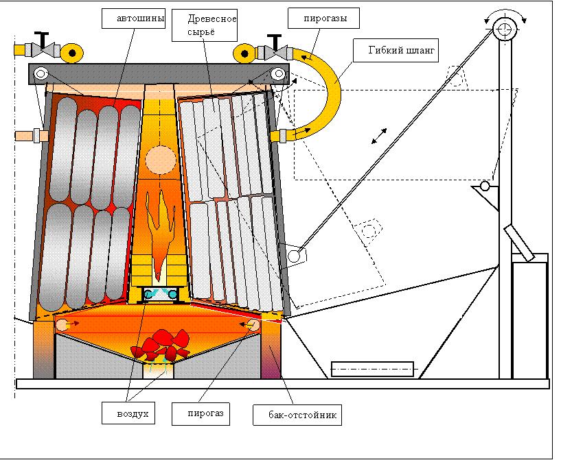 В мобильной пиролизной установке наиболее полно сжигаются горючие газы. Экономия дров при сжигании в топочной камере достигает до 25%. Кроме того, в процессе прогрева котла и карбонизации участвуют пиролизные газы, выходящие, при усушке древесины.