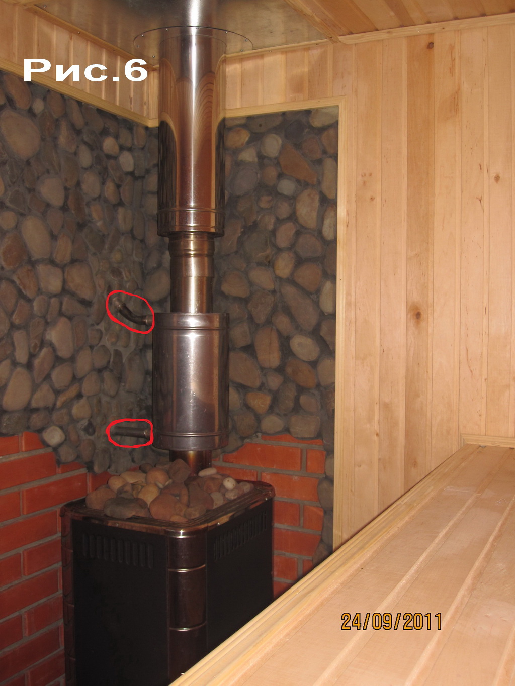 1. Для переделки проблематично. Печь установлена Термофор Компакт 12. У нее выход дыма около стены, а не по середине (рис.5). На печь сразу установлен регистр, а от него трубы в стену на выносной бак (рис.6). Если переделывать дымоход на середину разделки - придется переделывать все - выносной бак, трубы к нему от регистра - т.е. ломать всю эту красоту. Сендвич заканчивается сантиметров 40 над керамзитов, далее на него надета оцинковка d=120. Она поднимается выше шифера на высоту 1,7 метра. Проход через шифер: в месте прохода шифер выпелен 60х60. Там где выпелен-лежит лист жести, т.е. дым.труба выходит из чердака через лист жести. Какие есть еще варианты для исполнения более пожаробезопасной разделки ?