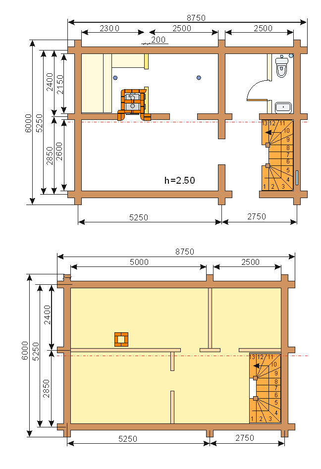 Заказал сруб для охотничего домика с утепленной мансардой и баней на 1 этаже (схемы ниже). Планирую наезжать туда (Ивановская обл.) 2-3 раза в месяц на 2-4 дня круглый год. Сруб из бревна d 25 см. Между парной и помывочной деревянная утепленная перегородка.