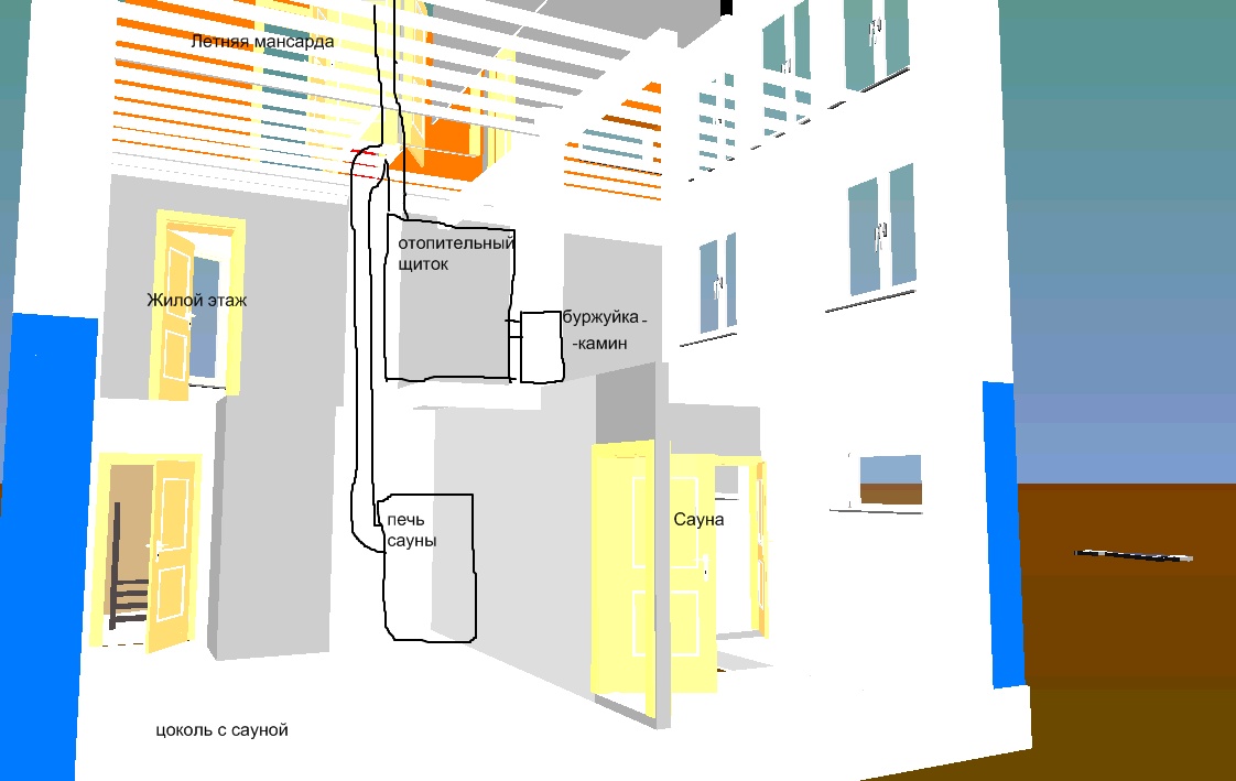 вашу площадь отпить просто буржуйкой со щитком можно лишь на некотрое время точнее на определенную площадь но не весь дом. Хотите всё отпить печью-надо печь помощнее.Боюсь во все отдаленные помещения и не обогреть,может лучше сразу прикинуть водяное отопление? Если по санузлам и все такое у вас напряг нету то можно соорудить нечто типа каминопечи.Тут печников хватает-обращайтесь.По вашим тут рисункам -без бутылки не поймешь,гораздо проще были б разрезы.Извините если что не так.С калядами!!!