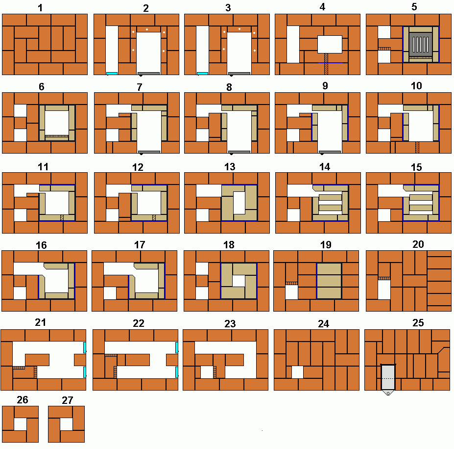 В 5-м щель 1 см делается перед нижним шамотным кирпичом, а все остальные синие линии - только 0.5 см. Картон также можно уложить на шамотные кирпичи 19-го ряда, чтобы облегчить работу по перекрытию свода.