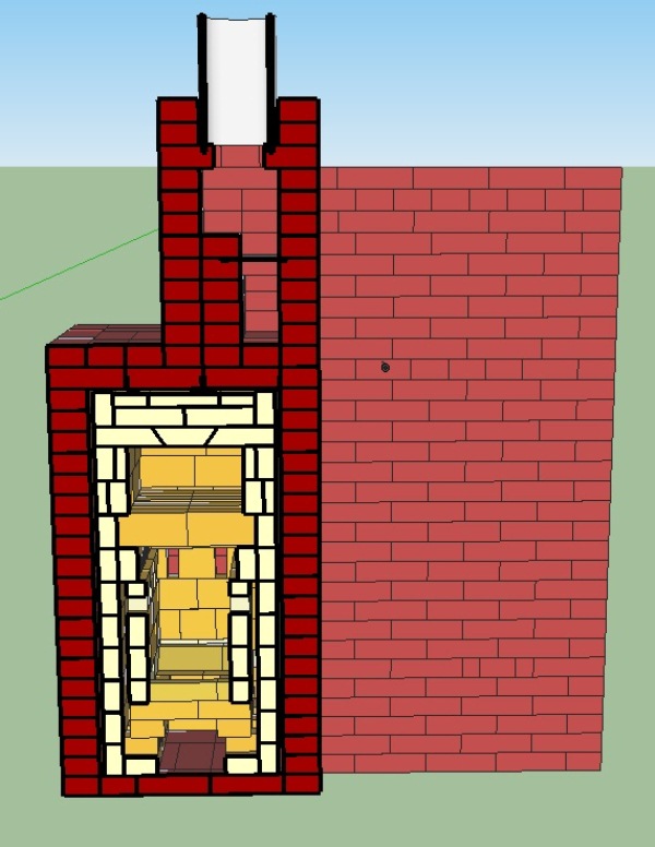 На месте старой русской печки планируем построить новвую. Такая конструкция удовлетворяет всем нашим условиям. Высота печки 2.1м, а потолка 2.4. Чтобы не делать распушку, решили поставить сэндвич и обложить его кирпичом. В целях экономии кирпича футерована только топка с ХК, да и местные печники убедили что Боровичский керамический кирпич прекрасно держит температуру.