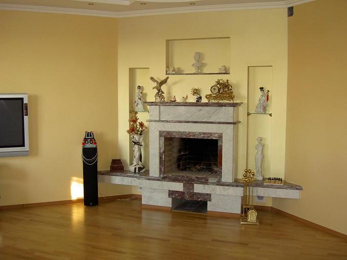 Кирпичный камин, облицовка мрамор