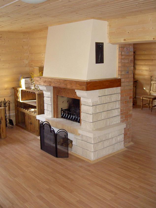 Кирпичный камин, облицовка известняк с Жигулевских гор, с верху деревянная балка, дымосборник обшит ГКЛ.