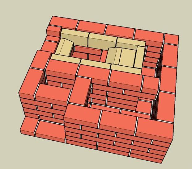 На рисунке исправленный вариант печи. Проект не выкладываю, т.к. не уверен насколько критично необходима перевязка опускного канала с ядром? Можно ли сделать перевязку только по совпадающим рядам, или нужно по всем? Если перевязка реально необходима, исправлю проект и выложу.
