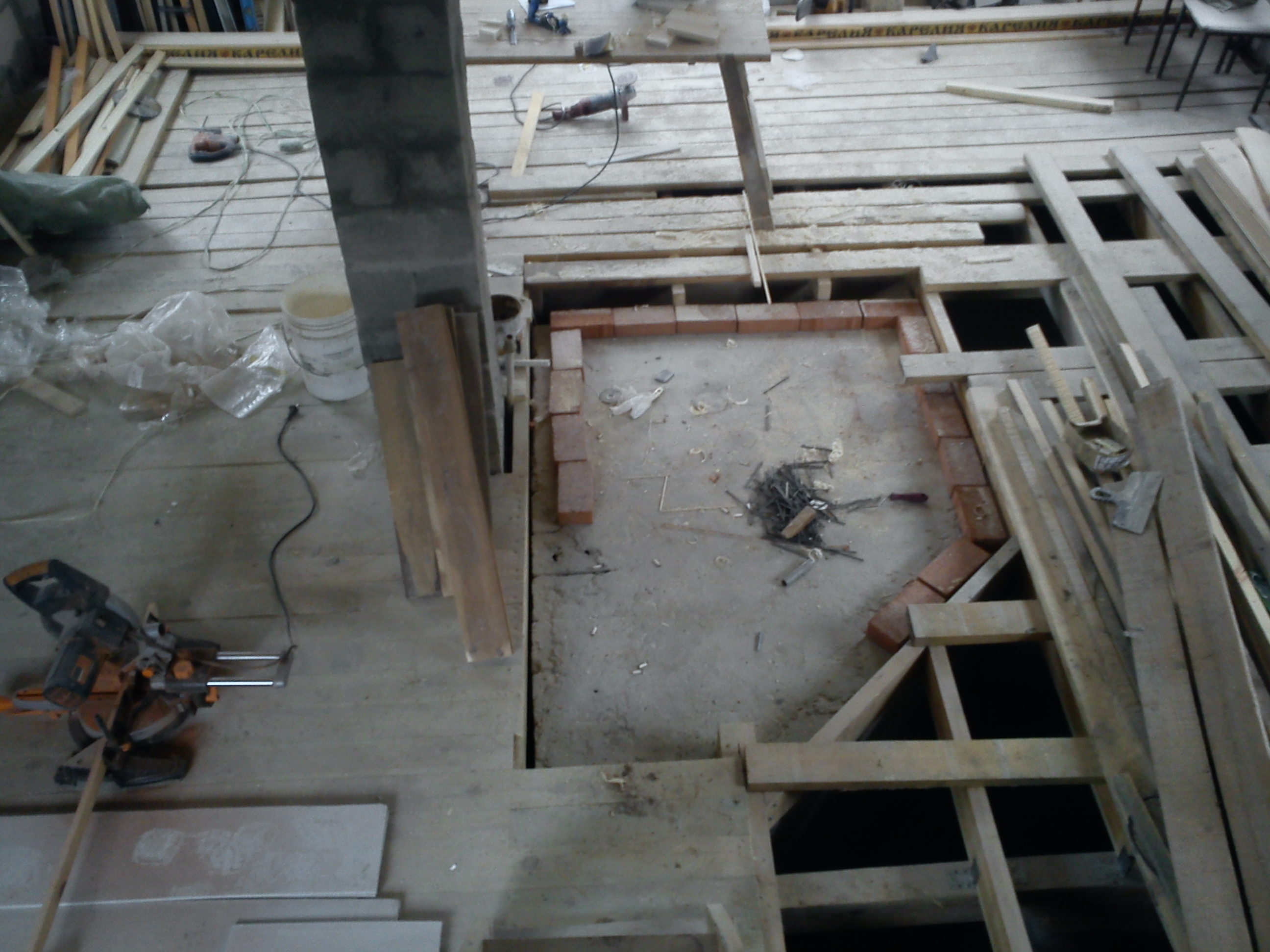 справа от фундамента и вниз, каминная комната,