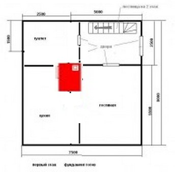 2. Определить место под фундамент и его размеры. (предположительное положение печи отмечено красным цветом, топка из кухни)