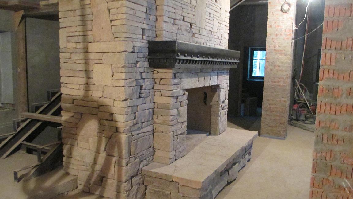 Камень что то близкое к слоистому известняку, клей "Фиксатор", клея в шве нет, только между телом камина в обвязке и камнем. "Сухой шов"