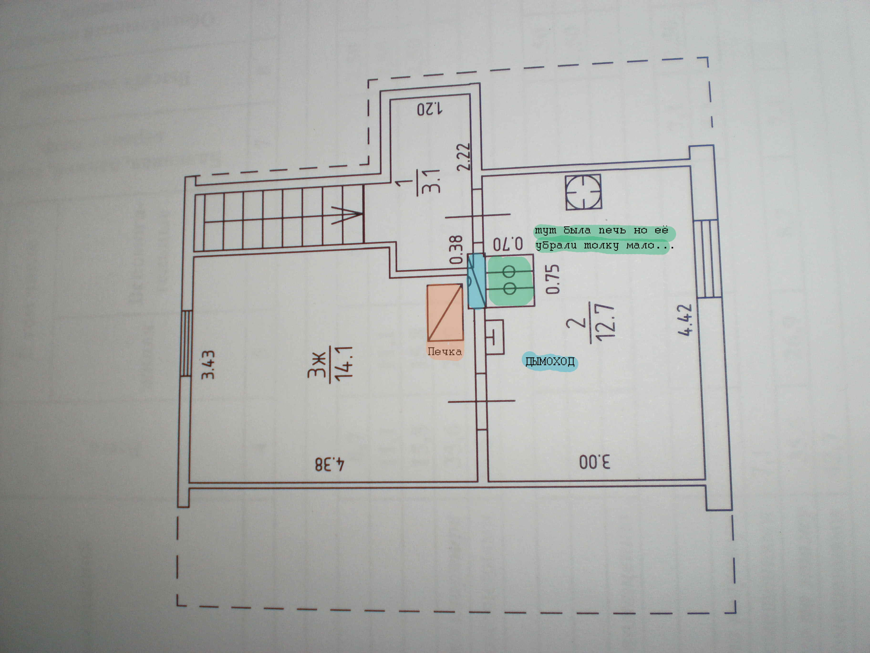 Это старый немецкий дом у нас весь город состоит из таких домов....Дымоход разделен на 2 части, вся проблема из за него......он посередине с обоих сторон двери, но межкомнатную дверь можно передвинуть и тут стоит вопрос какую печь построить чтобы поставить в торец дымохода... Перекрытие пола деревянное, печь на фото кирпичная , в Пруссии были свои технологии дома очень прочные... Обе печки стояли изначально, вообщем под одной печью которую разобрал просто деревянное перекрытие. Это место обозначено зеленым, можно там , но какую???