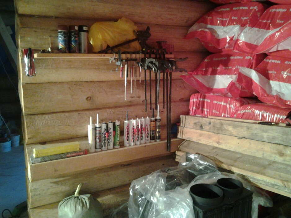 Организация рабочего места это первое, с чего надо начинать. На многих объектах, когда приезжаешь первый раз, чёрт ногу сломит. Так и на этом было. Опилок по колено, доски, обрезки, вата раскидана... День ушёл на то, что бы всё привести в порядок и сделать подобие мастерской, что бы каждый инструмент был под рукой. Очень удобно обрисовывать инструмент на стендах и подписывать каждое место. Тогда, в конце рабочего дня сразу видно, какой инструмент не на месте, а где-то валяется. Всем советую. Не пожалеете!