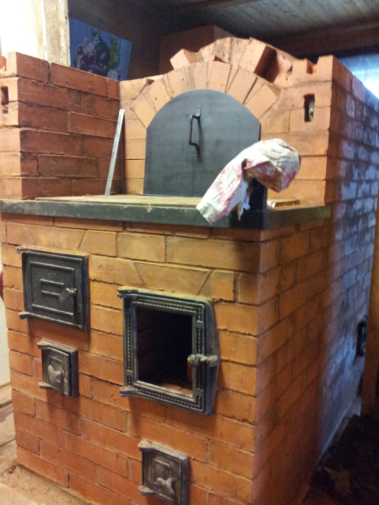 в данной печи у меня изменено положение трубы, в результате чего фасад стал выше на два ряда, кроме этого была поставлена вьюшка и самоварник. Вместо железной трубы-стойки поставлена балясина от чугунной лестницы ( нашел у соседа в металле). Работает , высота трубы 5,7 метра.