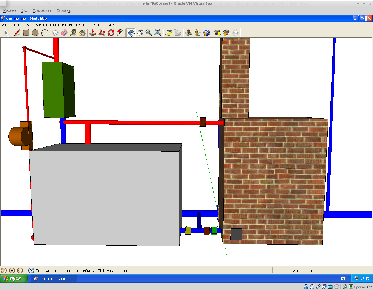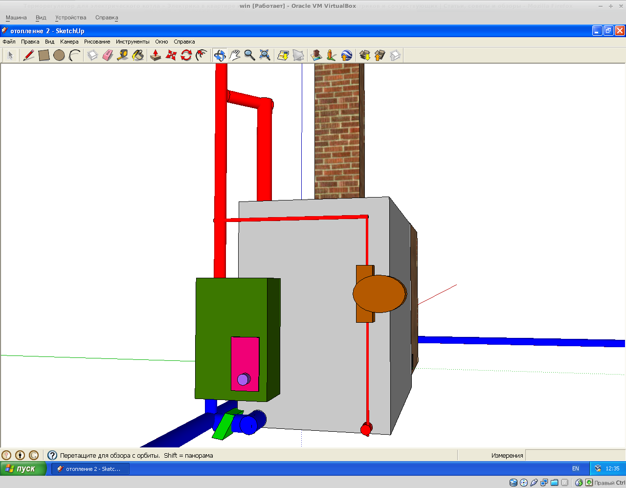Источники тепла: электрокотел (зеленым цветом) и печь-котел (печь котел имеет два вентеля - коричневые ромбы и кран-слив - зеленый ромб).