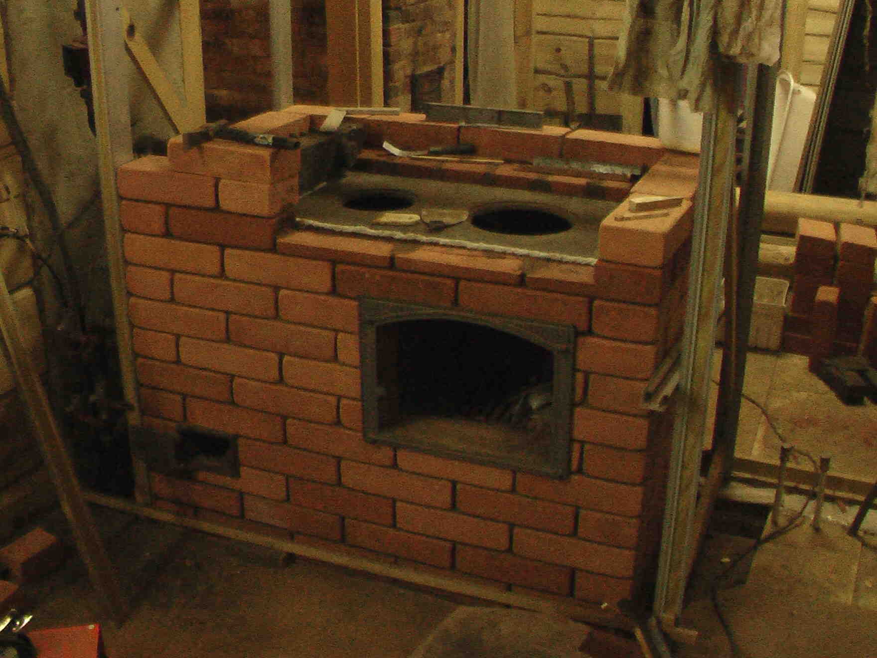 Здесь кирпичи настелил пониже и небольшие зазоры меж ними. Это для разгрузки (по теплу) потолка варочной. Хотя, думается, там выше 250* не будет.