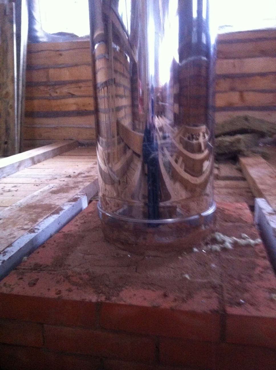 Дымоход сделали сандвич внутренний диаметр 250 мм сталь жарастойкая нержавейка, наружний 350 кислостойкая нержавейка, высота от перехода до дифлектора 5,3 метра выходит на крыше от конка 60 см и возвышается над коньком 25-35см
