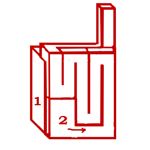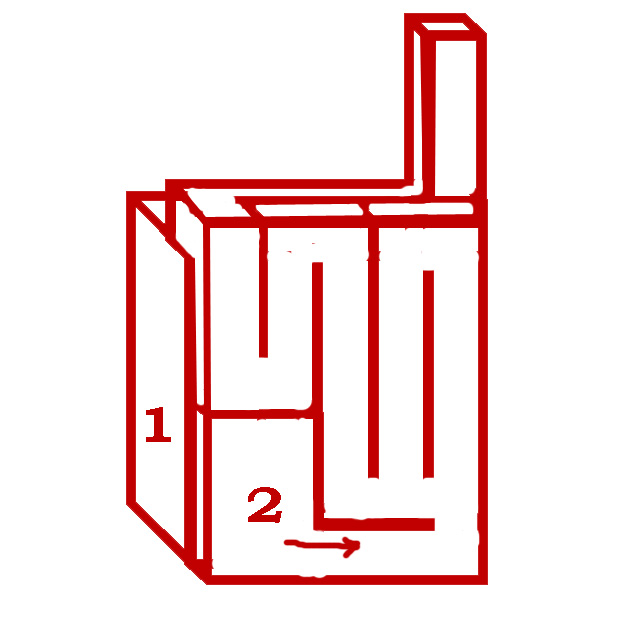 Под цифрой 1 - глухой канал. Дым туда проходит над духовкой. Единственный выход - под духовку