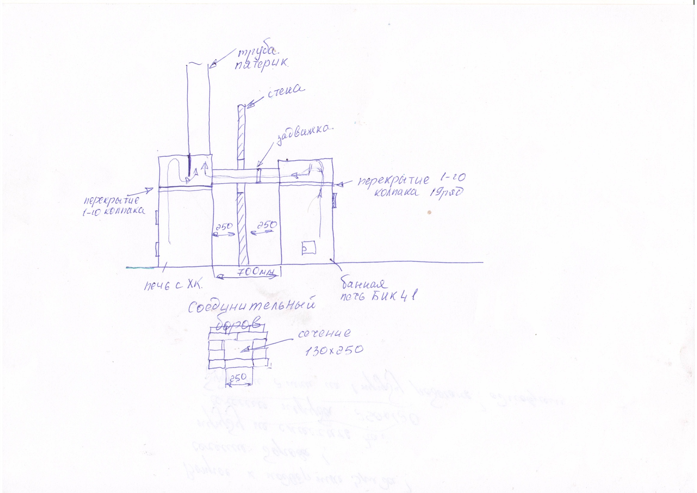 ELM заменить стену пенобетоном не представляется возможным ,так же как и сдвинуть печи вплотную , скажите в представленном варианте с горизонтальным боровом ( в планах в него поставить гильзу приблизительно в кирпич 250*120 мм )без уклона и с разделительной рассечкой в трубе , и размере трубы в шестерик конструкция работоспособна при одновременной работе двух печей ???? ELM , что скажете ?