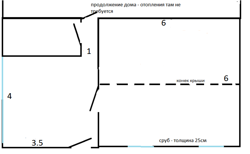 Требуемая для отопления часть дома состоит из основной комнаты, из бревен (сруб), и веранды, без утепления. Застеклена.