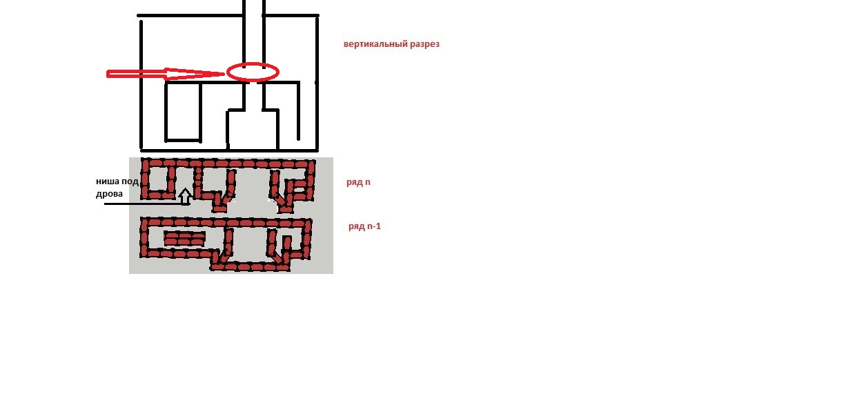 Нарисовал схему движения газов при печном режиме, при топке в режиме камина задвижка над топкой будет открываться. Размеры можно понять по ряду кирпичей. Вопрос: будет ли работать такая конструкция, нет ли принципиальных ошибок?