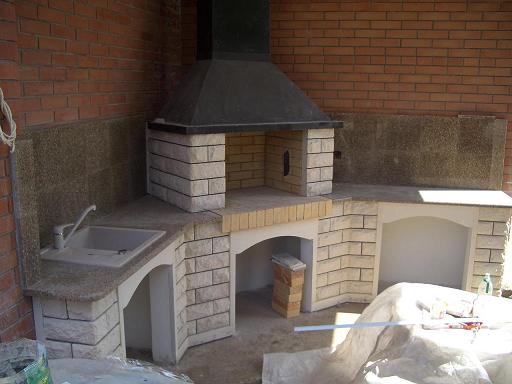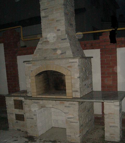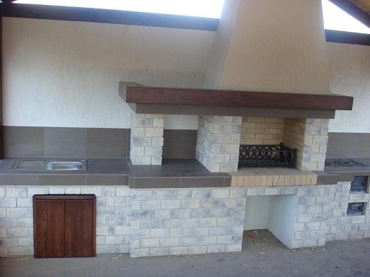 Конструкция выполненна из пенобетона и шамотного кирпича и облицована иск. камнем. В конструкцию входит варочная печь, мангал и разделочные столы. Общ длинна 5 м шир 0,8м