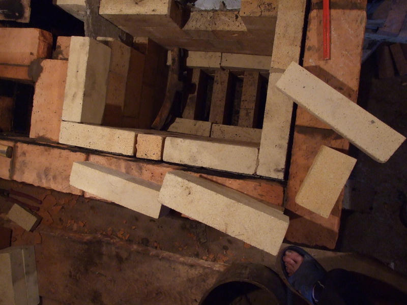 Мои предположения. Камни выкладывать таким образом, чтобы каналы (щели между шамотными кирпичами) оставлять максимально долго открытыми. Т.е. Первые камни ложить прямо на кирпичи, не выходя за его контуры, второй слой в виде перекрытия между нижними слоями, чтобы не завалился следующий слой в канал, и тд слой за слоем стараться выкладывать камни, чтобы они не перерывали каналы.