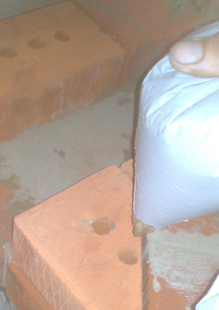 Для заполнения отверстий в кирпиче придумал эдакий кондитерский наполнитель - плотный пакет с дыркой в углу.