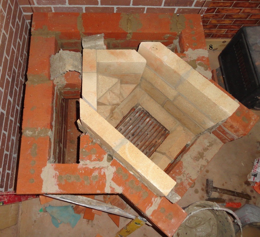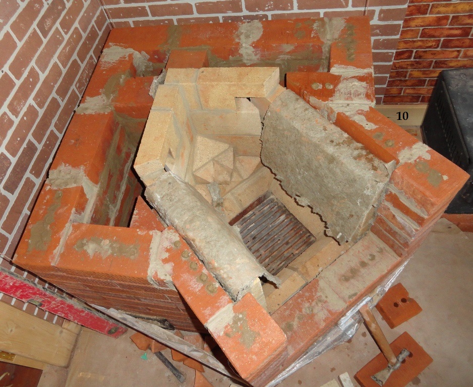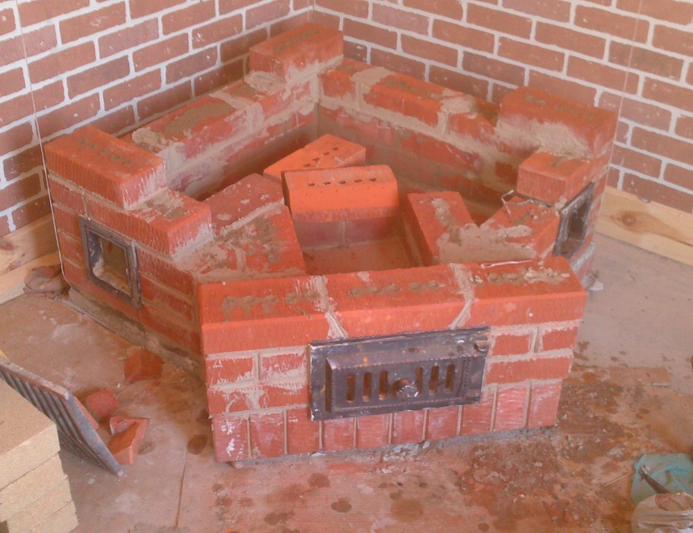 Дело в том, что большую дверцу можно было разместить либо углубив ее в сторону топки, как у В.Солина ХК угловая, либо выдвинув ее наружу. Я выбрал второй вариант, свой. Получилось что топочная сторона выступает таким зубом. А закрепить кирпич в таком положении нелегко, если фундамент без запаса - заподлицо - 3,5х3,5. Фундамент из блоков получился выше уровня пола. В общем придумал выложить нижний ряд топочной стороны на ребро (эдакой кирпичной балкой на 10 кирпичей), выпилить в кирпиче место под выступ фундамента так, чтобы высота оставшегося кирпича была равна высоте кирпича лежащего плашмя. Ну и собрать всю эту балку на стекловолоконную арматуру, т.к. она не особо расширяется от тепла как металл, ну и по идее она жаропрочна как и стекловолокно. Склеить балку я решил готовой мастикой того же Терракота.