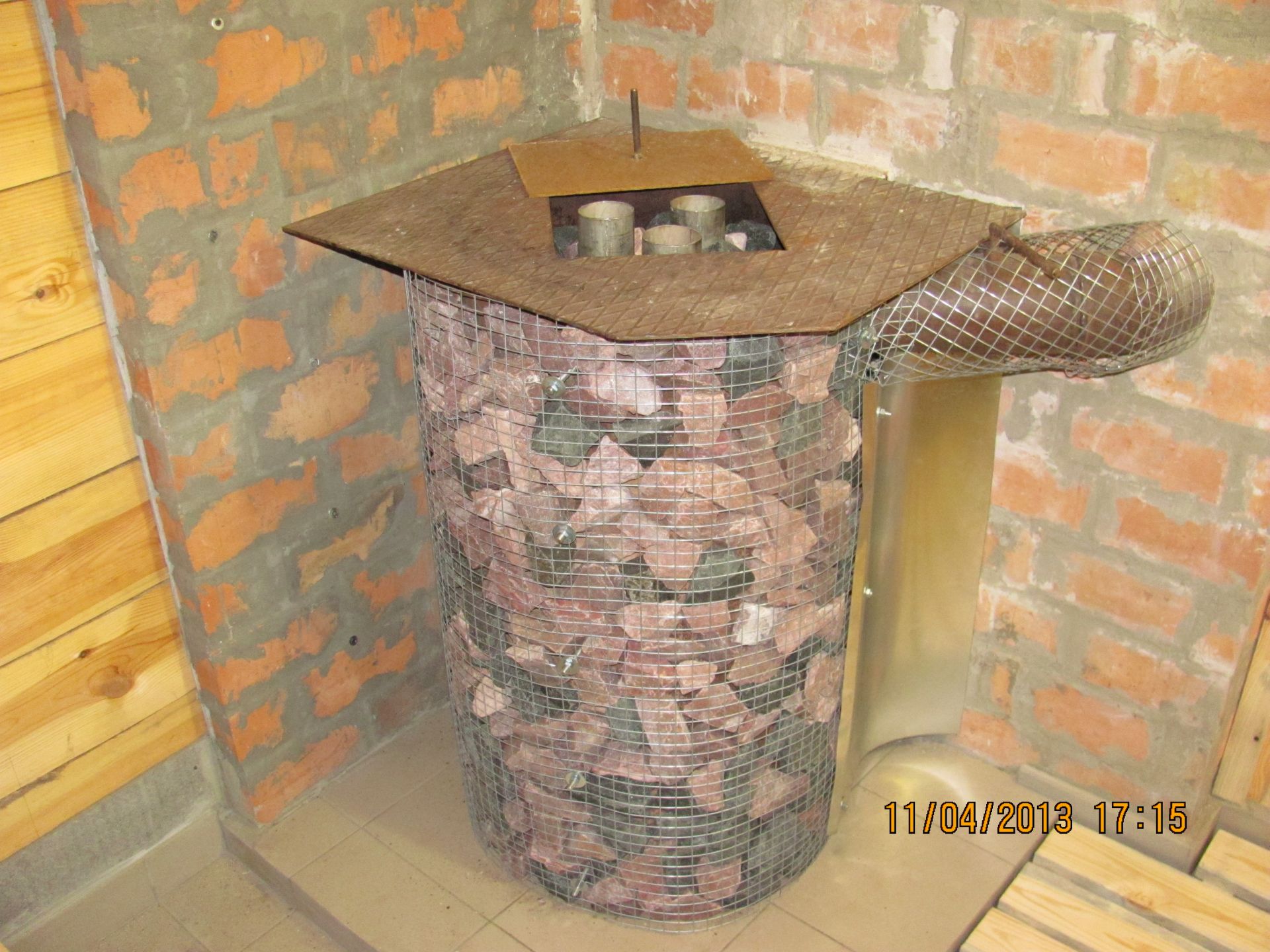обогреваться.Первые банные сеансы подтвердили правильный ход мысли и приятно удивил тёплый пол в парной и напрасно дымовые горячие газы не "вылетали в трубу",а эффективно обогревали отопительный щиток-перегородку,т.е. в раздевалке-тамбуре тоже было тепло.Представляю несколько снимков и ролик