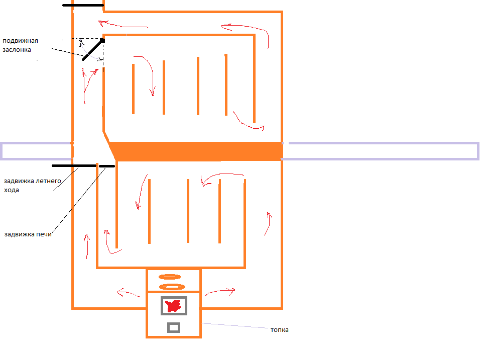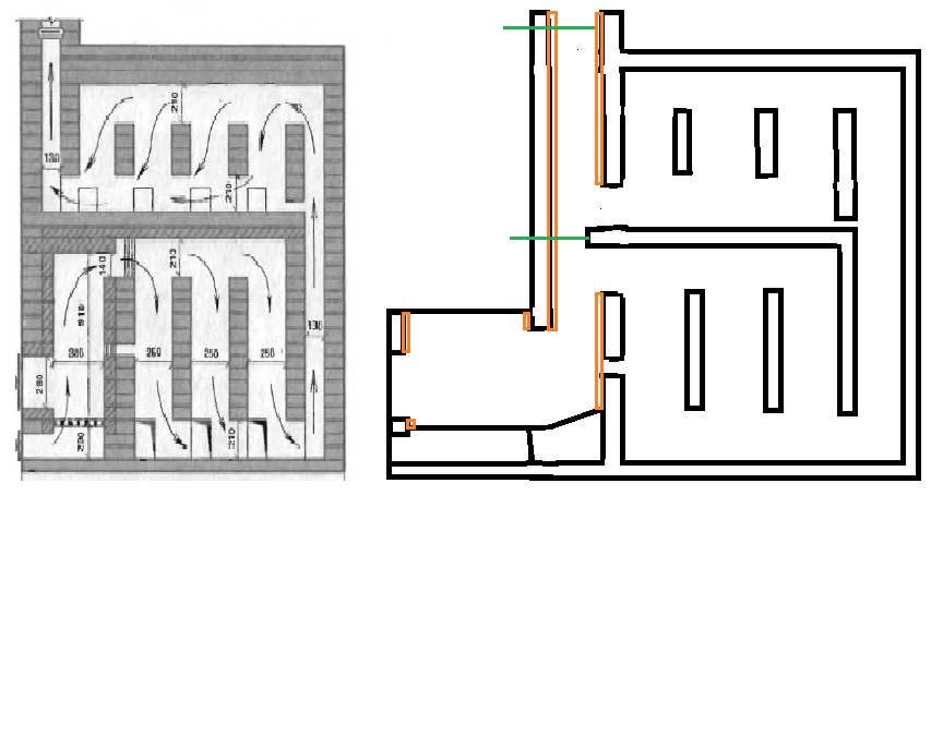 Нашел схему в инете ,немного переделал ее . Печь будет сложена кирпичем на ребро ,в топке установлен котел-дипломат ,через транзитный канал ,футерованный огнеупорным кирпичем ,выход на второй этаж там входит в щиток (канальный или колпаковый ? что посоветуете ) ...