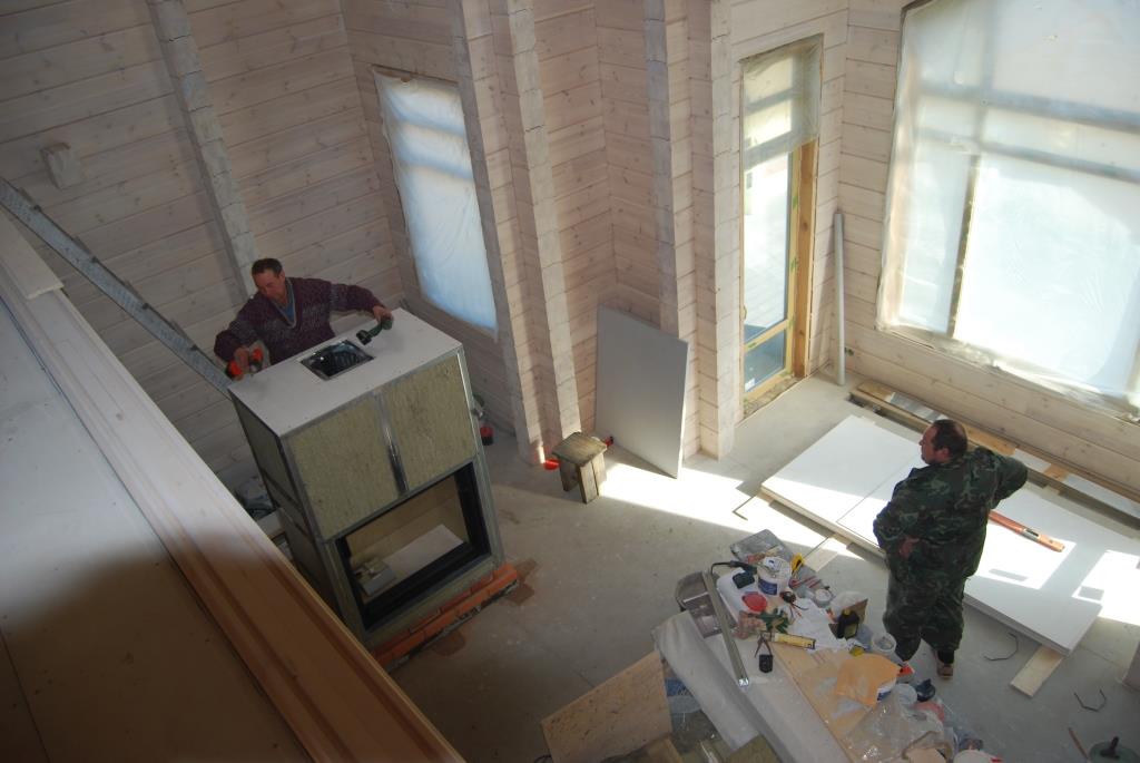 Монтаж... Все усугублялось ограниченностью пространства под камин. Лестничники оттяпали места сколько им надо... а выдвинуться в перед нам не позволяла стропильная система, или перешагивать через шаг стропилы... тогда вылезаем за границы подиума на 50 см... Архитектор закричал "АХТУНГ" низзя ни в коем случае. После ночного " мозгового штурма" и многочисленных согласований с заказчиком и архитектором а так же прорабом по общестроительным работам, было выработано решение, которое устроило всех!!!