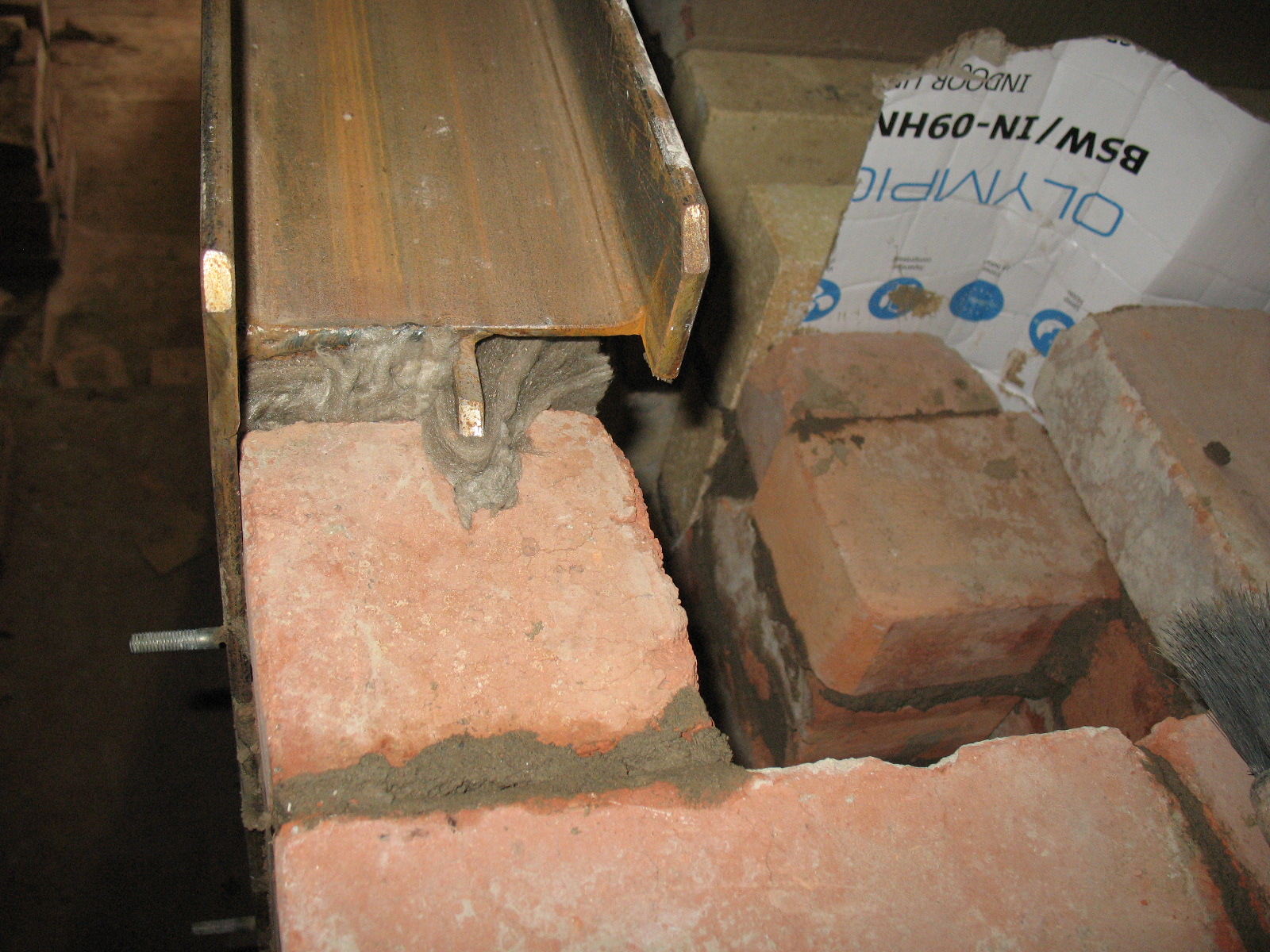 | Балка перекрытия вставлена в верхний швеллер через базальтовую прокладку, но опирается только на кладку |
