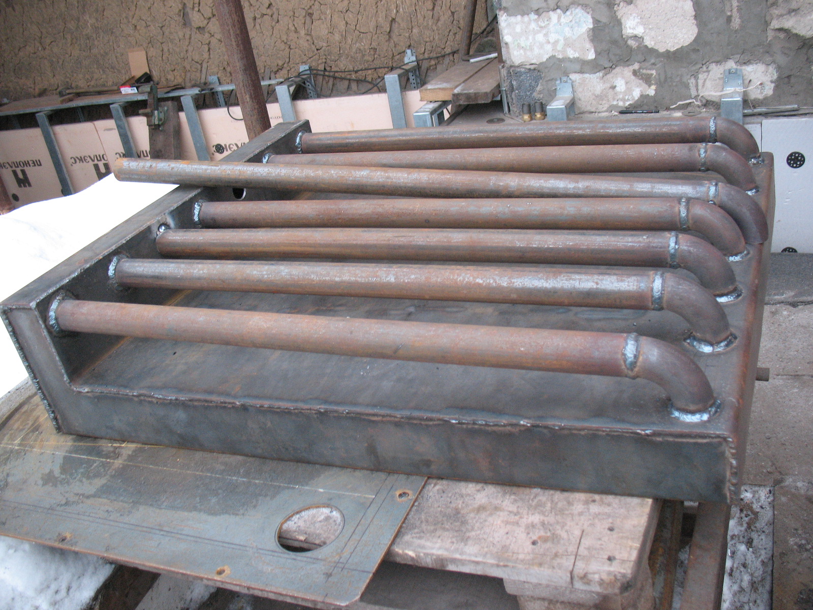 | Передняя стенка котла. Внутренняя сторона. Размечена для приварки оставшихся ребер жесткости. Бобышки - для крепления гофротрубы контура ГВС. |
